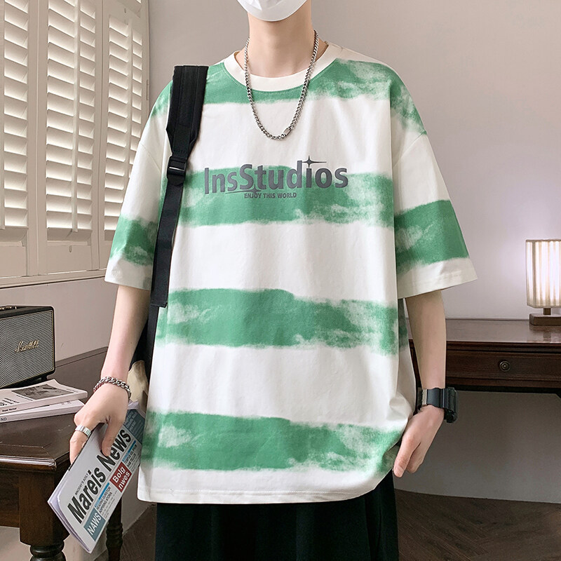 ストライプコントラストカラー半袖Tシャツメンズ夏新作若者トレンドブランドゆったり涼しい半袖万能トップスTシャツ