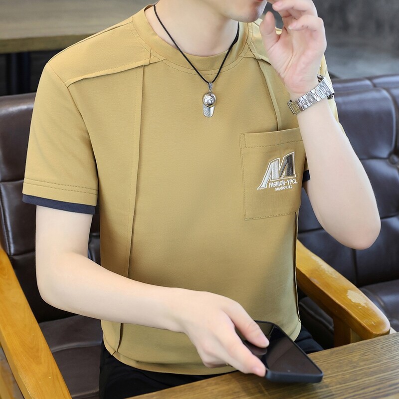 半袖カジュアル薄手刺繍ラウンドネックTシャツメンズ夏韓国版万能トレンドスプライシング半袖Tシャツトップ