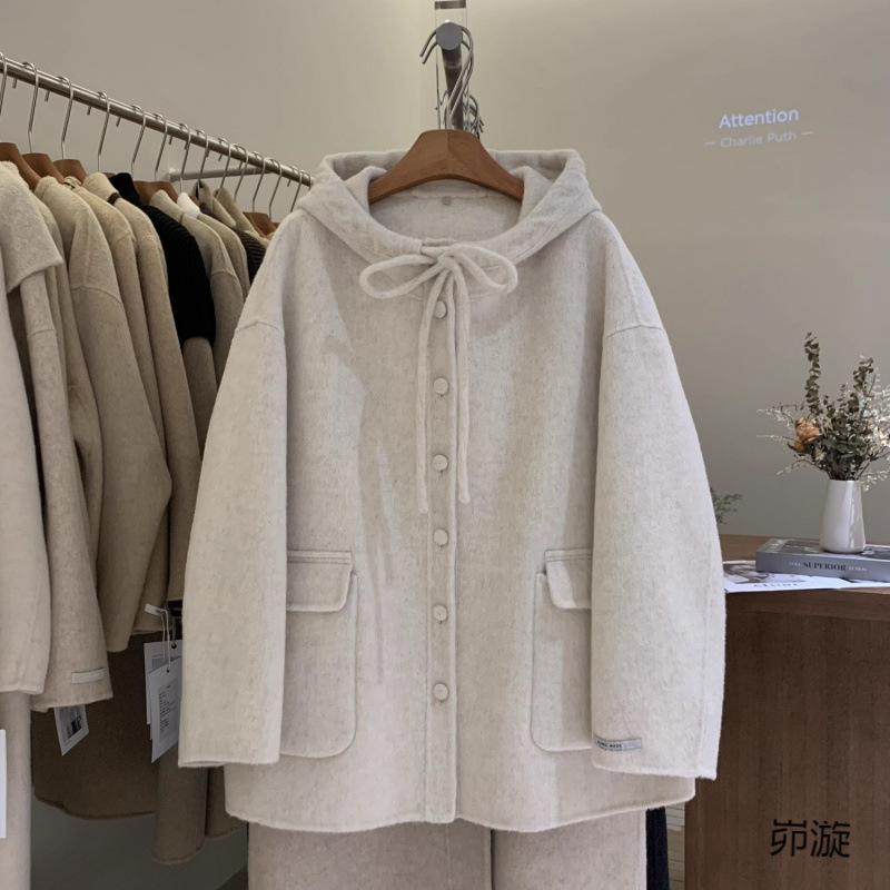 レトロチェック柄フード付き豪華なウールコート女性のための 2025 秋と冬の新しい韓国スタイルのルーズウールコートファッション