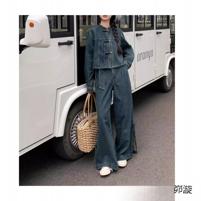 2025 新中国風のボタンデニムトップジャケット女性の季節の新しいカジュアルレトロワイドレッグパンツ 2 点セット