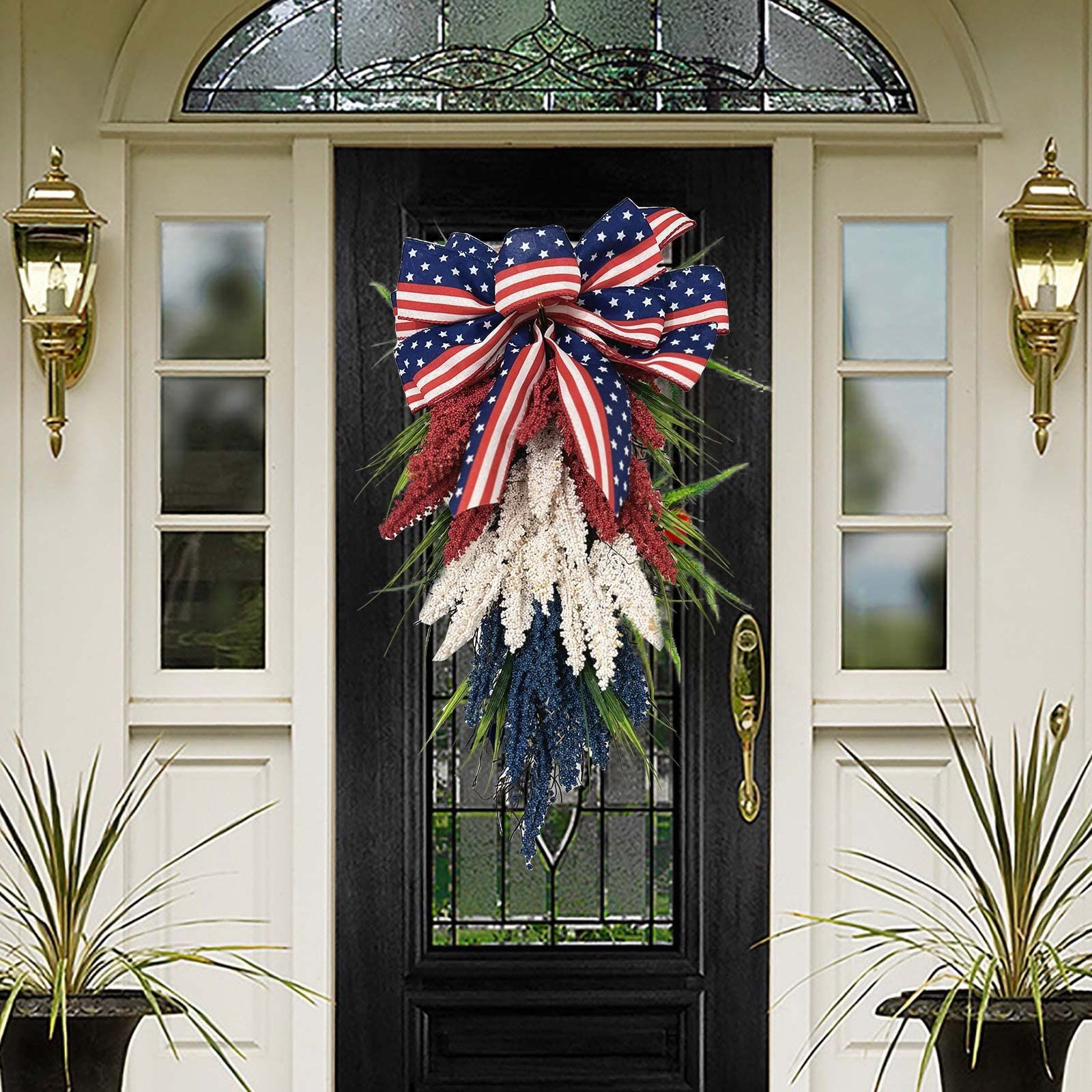 国境を越えて起爆したアメリカの独立日花輪のシーンは赤と白の青のシミュレーション麦の穂を配置して前のドアの装飾の扉を掛けます。