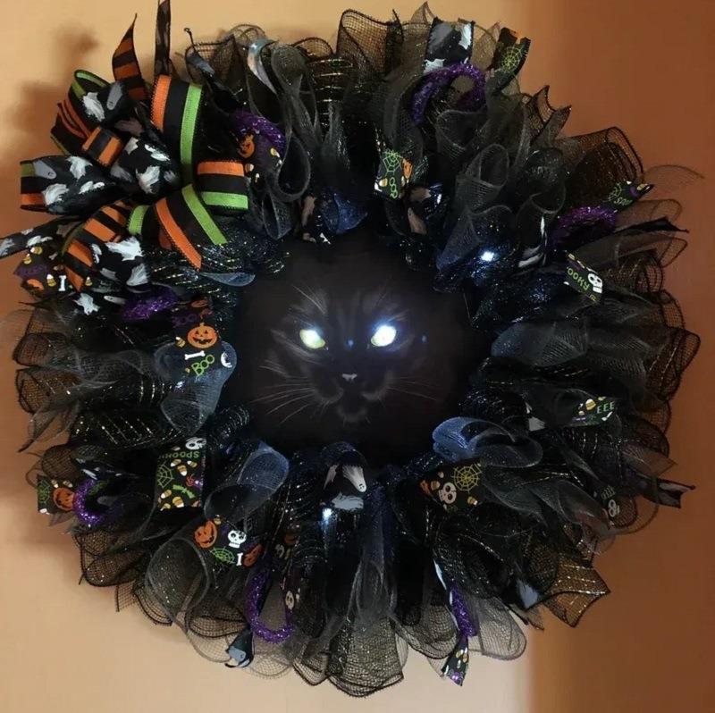 越境新品ハロウィーン怖い黒猫花輪灯付き黒猫花輪ハロウィーンパーティー装飾花輪