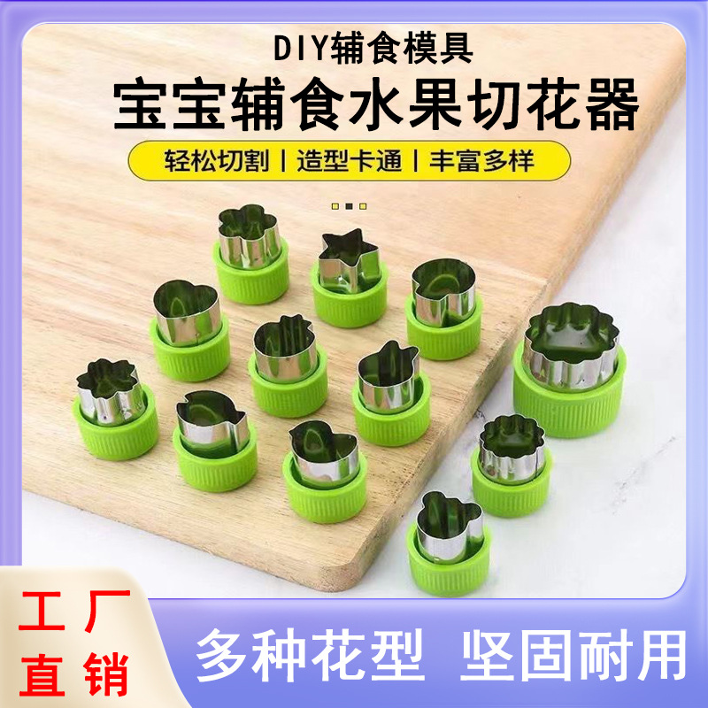 ステンレスの果物の花の型の漫画の野菜の果物は愛の蝶々の顔のマントーの赤ちゃんの補助食品のビスケットのプリントの鋳型を切ります。