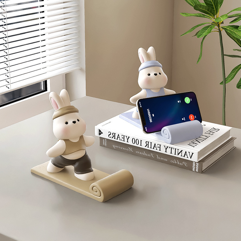 かわいいウサギの携帯電話スタンドにipadのタブレットを飾って装飾品を支えているオフィスのデスクトップに誕生日プレゼントを飾る
