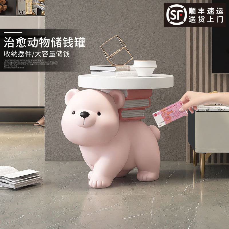 クリーム風熊が床に落ちてお茶の飾りを飾っている大型貯金箱は客間のソファーのそばには入れない