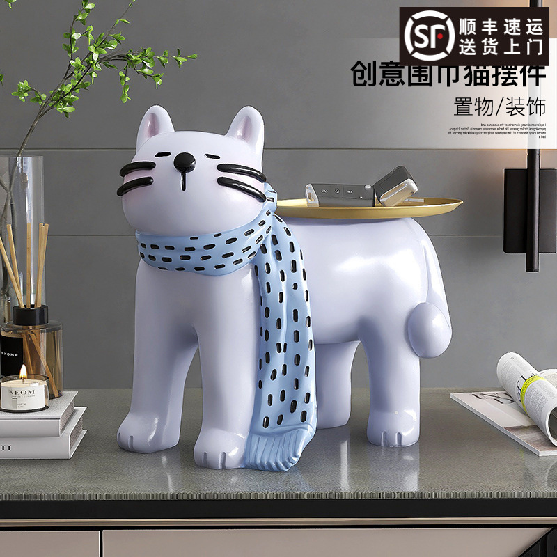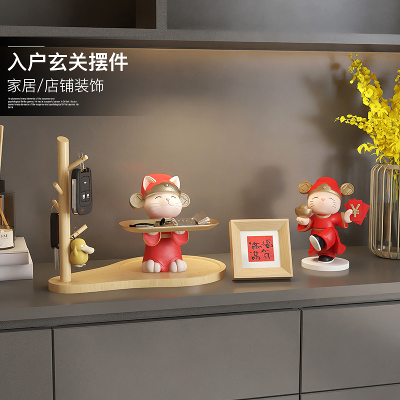 かわいい猫が家に入って靴箱の玄関に鍵を置いて家のアクセサリーを飾るリビングのテーブルトレイの新しい家の引っ越しプレゼント
