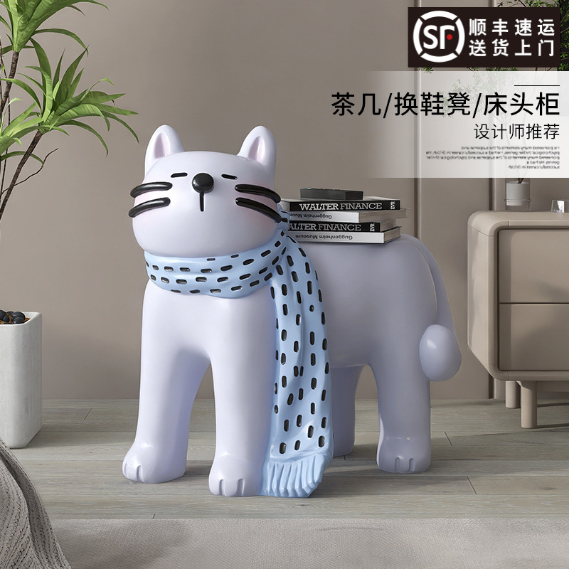 家に入る玄関の猫が靴を履き替えて腰掛けをして床に落ちて家の装飾品を並べます。