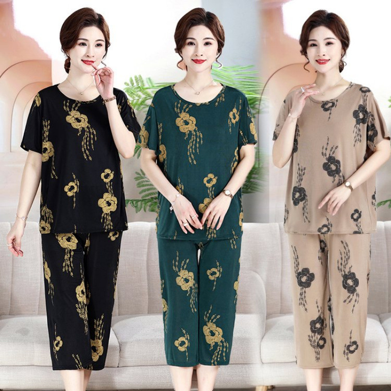 中年ママの夏服、おしゃれな年齢軽減ファッションスーツ、中高年の夏新作大きいサイズ半袖ゆったり2点セット
