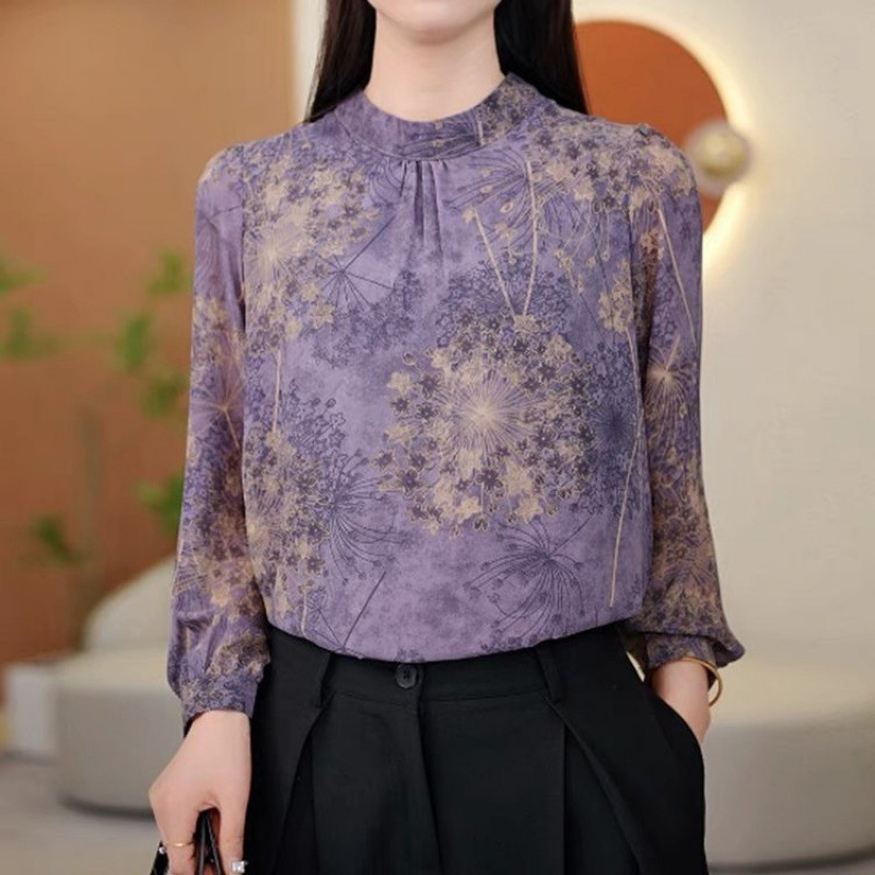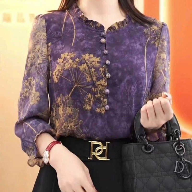 ママの秋の新作シフォンシャツレディースファッション中高年スタンドカラープリントデザイン気質トップス女性用