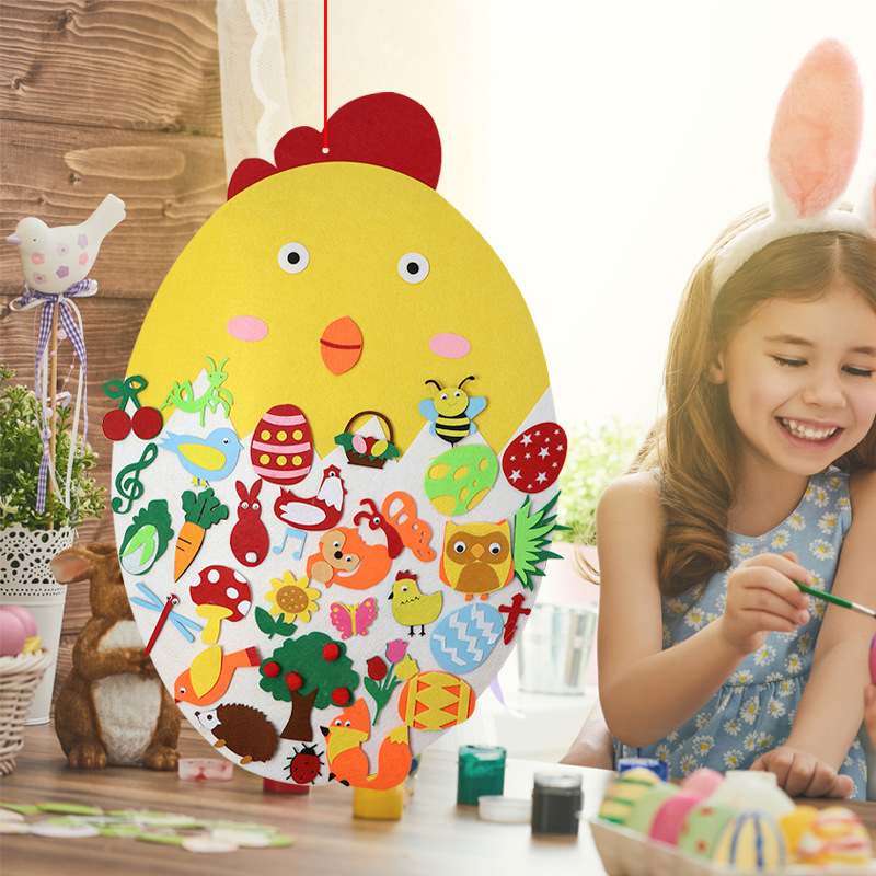 現物のイースターの扉は壁を掛けて子供の益智のおもちゃのフェルトの布の黄色のニワトリを飾ります。