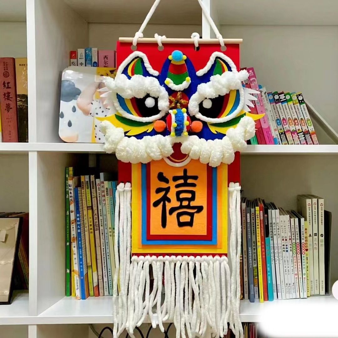 幼稚園の新年に目が覚めたライオンのタペストリーは学校の親子活動の手作りの授業を飾っています。