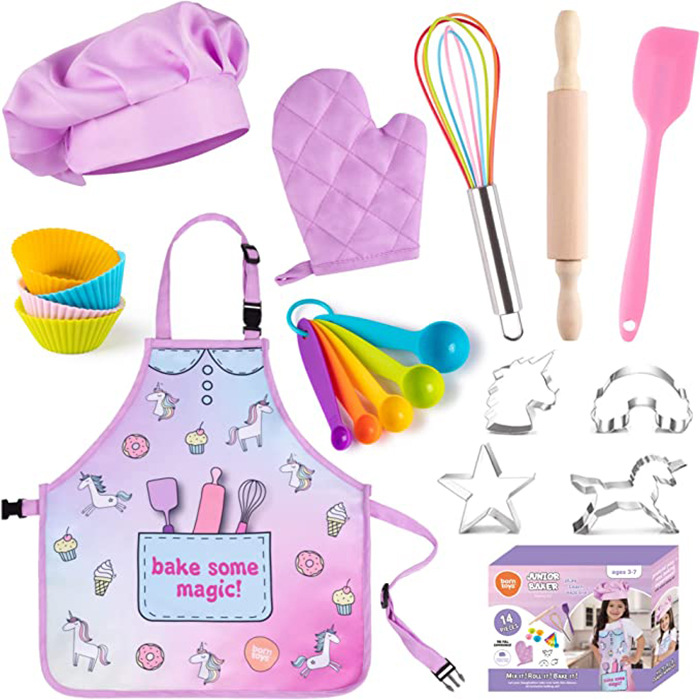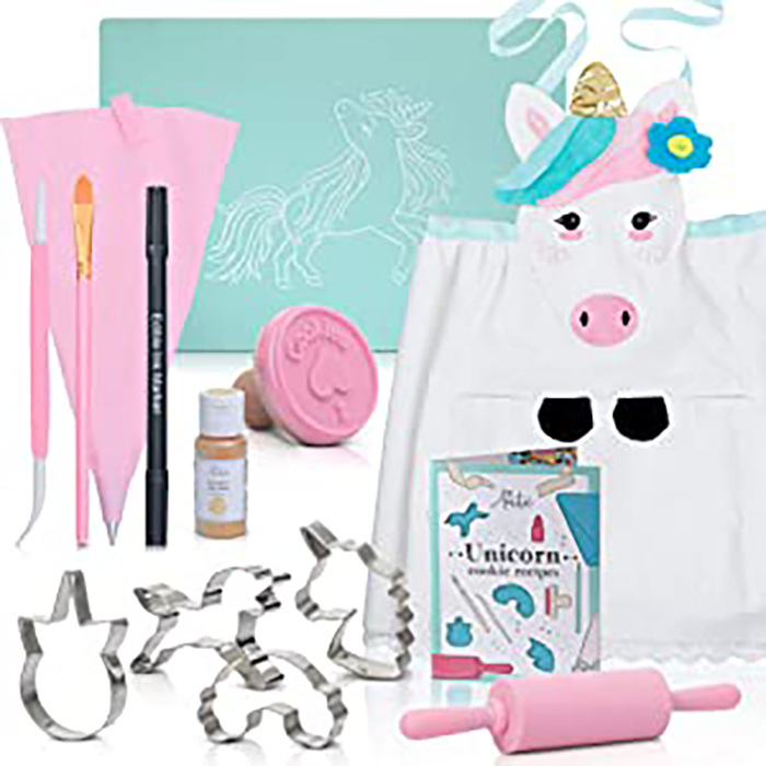 女の子のための子供のクッキーのベーキングセット-ユニコーンのエプロン、クッキーナイフ、14ピースの完全な料理セットを含む