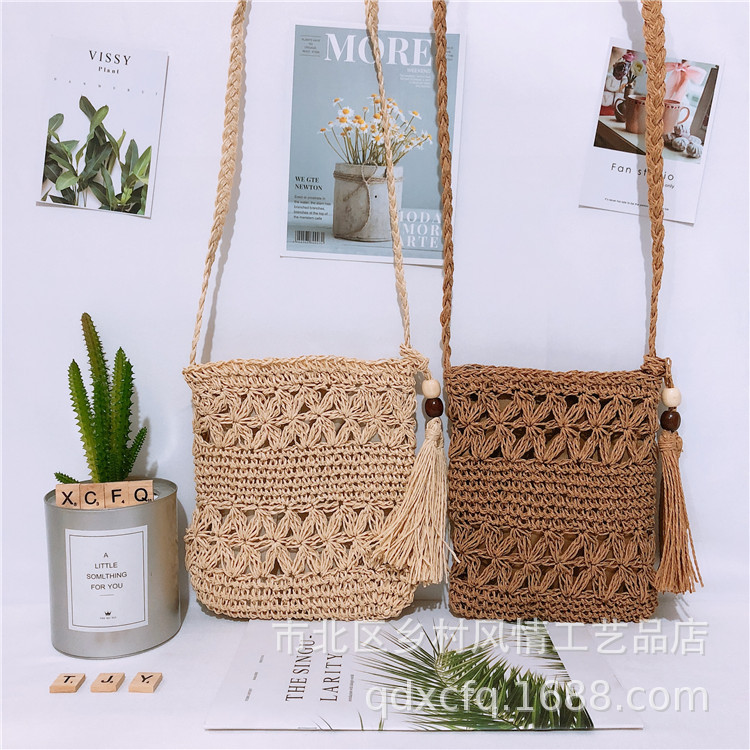 流蘇木珠方形斜めショルダーバッグins透かし彫り森系編みカバンシングル肩ビーチカジュアル女性カバン草編みカバン