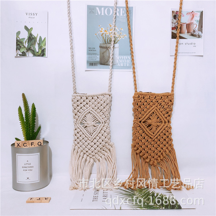 フリンジの三角綿の線の携帯電話のカバンの小銭入れの民族の風のカバンのシングル肩の斜めのショルダーバッグの綿の縄は女性のカバンを編みます。