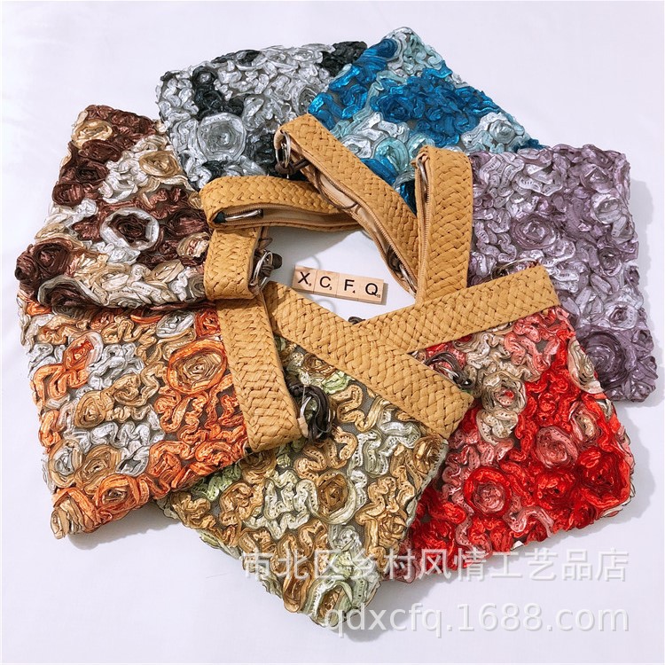 両面フックの花ins韓国版紙の縄の針のフリンジの斜めのショルダーの携帯電話のカバンの小銭入れの海辺の休暇の草編みの女性のカバン