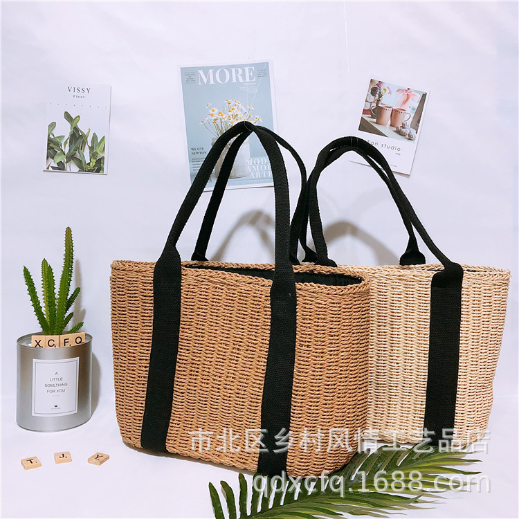 紙のひもの黒い布のinsのカジュアルな手提げの肩の草の編み物袋のビーチの女性のカバンの卸売り