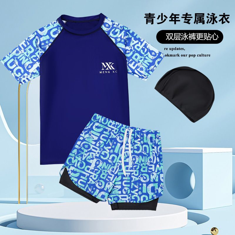 青少年児童学生専門訓練分体水着半袖上着二重水泳パンツ日焼け止め速乾セット