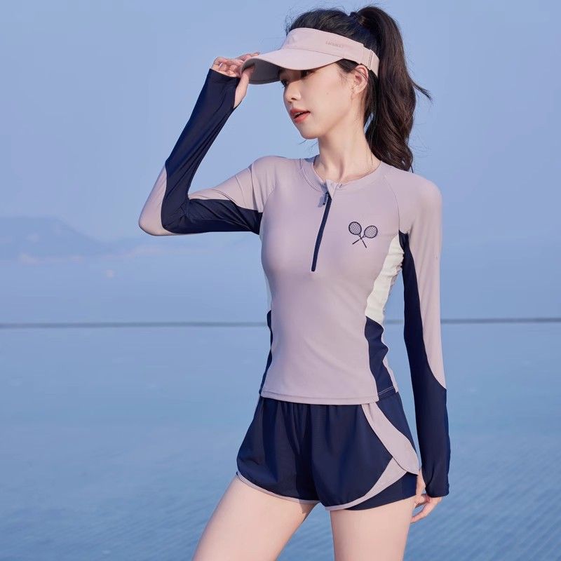 2025年新作女性用スプリット水着、学生が水泳を学ぶための新しい長袖日焼け止め、コンサバティブでスリムなお腹カバー水着