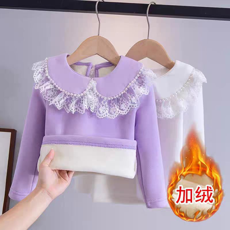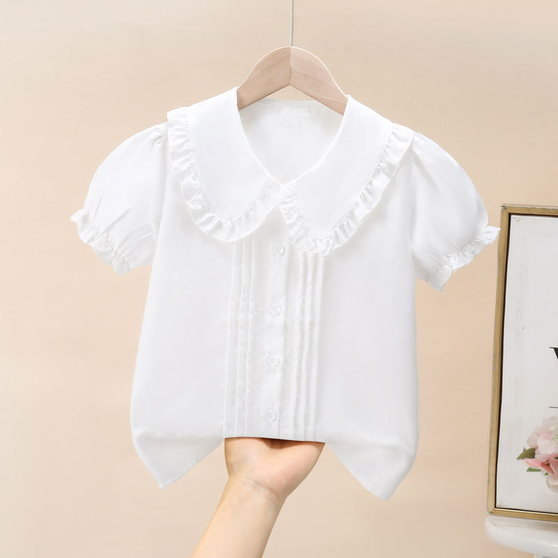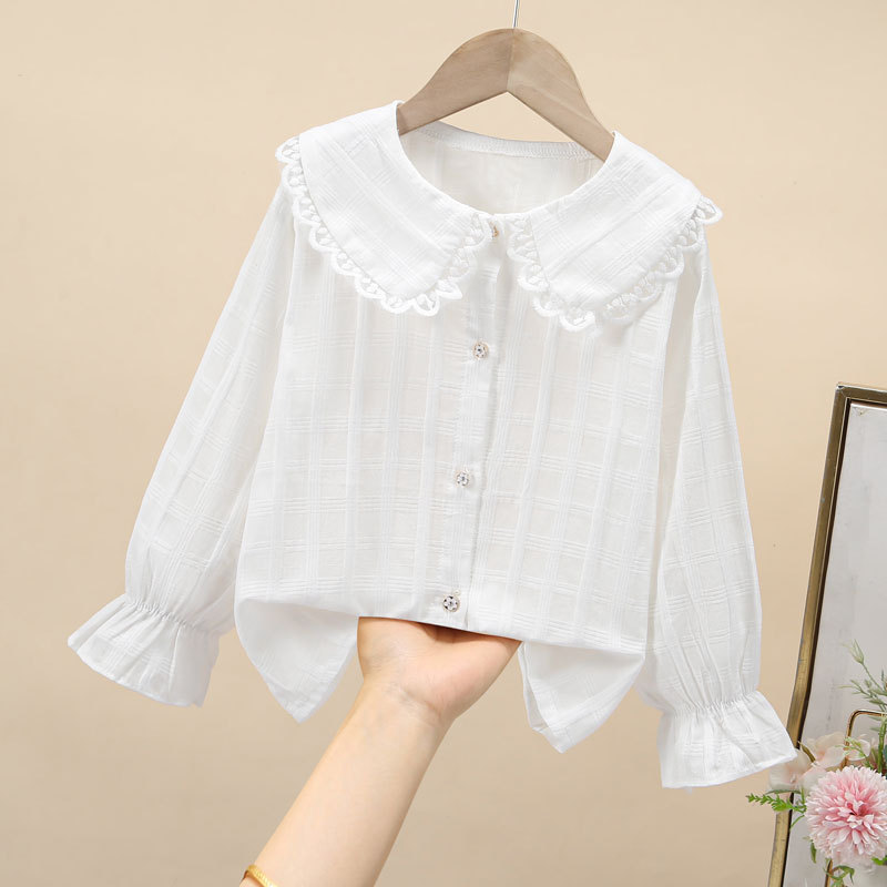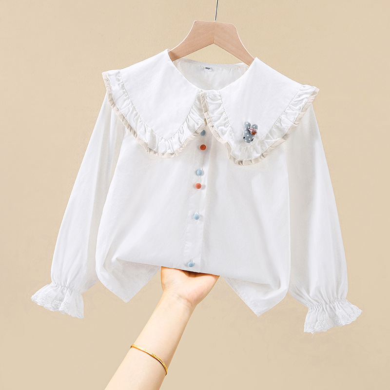 海外の女の子向け春秋新作シャツ、おしゃれな長袖白シャツ、子供用フリルレースドールカラーインナー