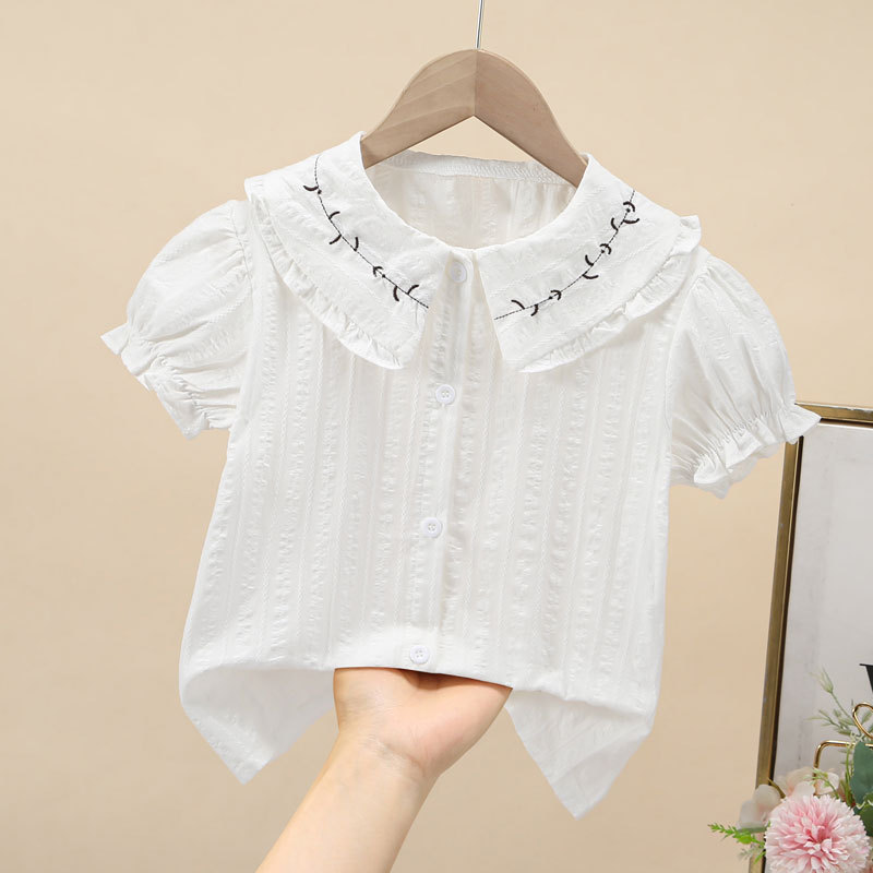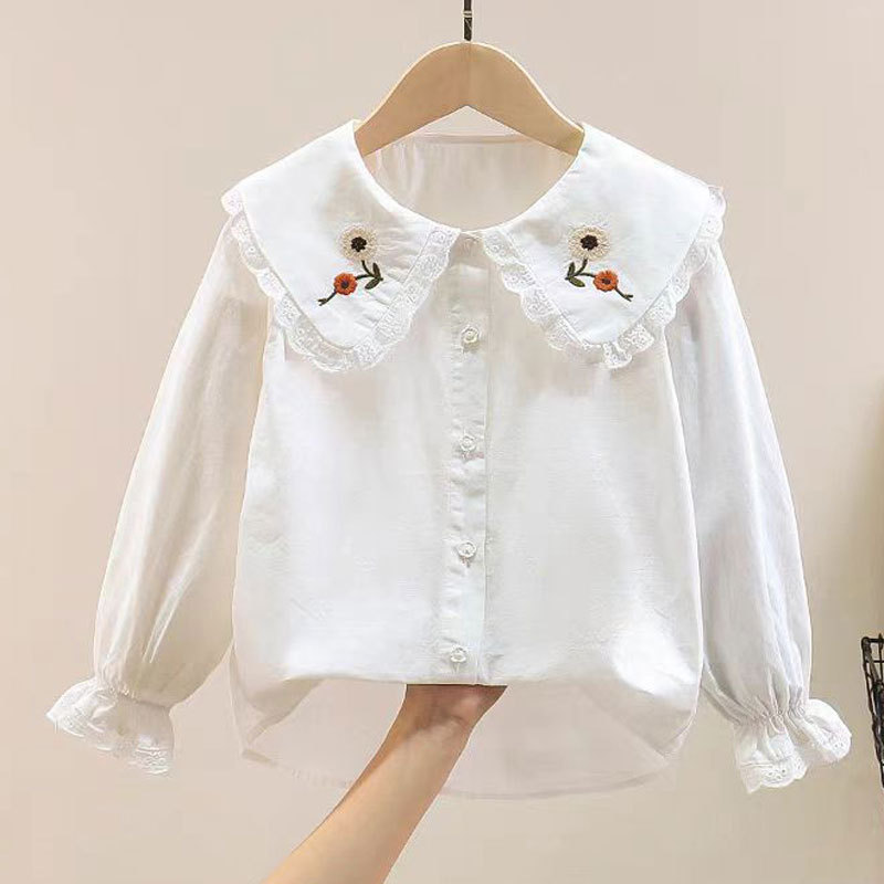 女の子の春と秋のシャツ新しい韓国スタイルの長袖白シャツ中型と大型の子供用刺繍入り人形襟ボトムストップストレンディ