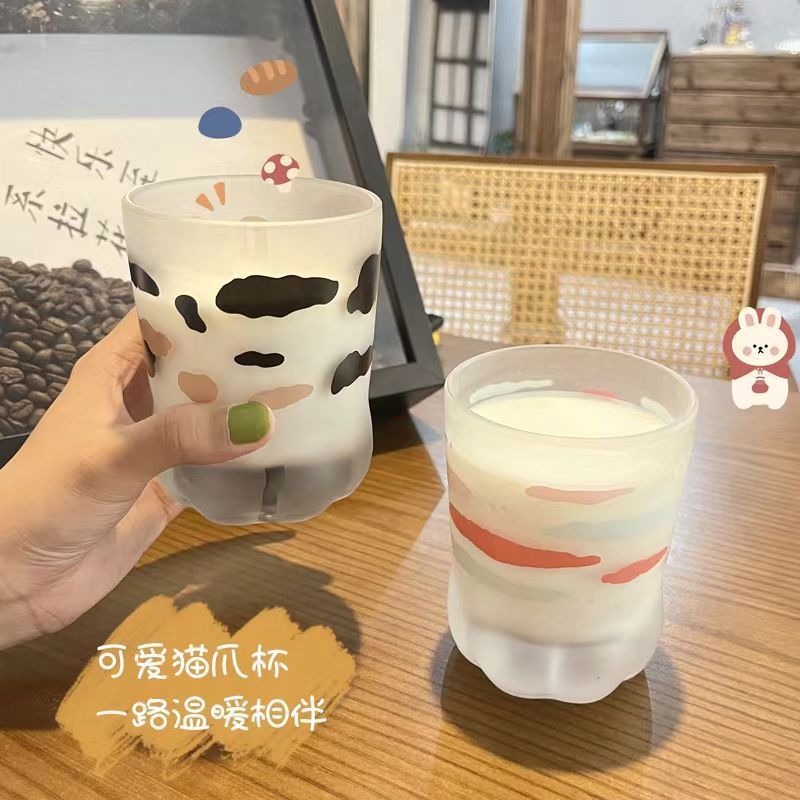 卡通情侣创意礼品装猫爪玻璃杯女生儿童好看猫咪水杯带勺可爱杯子
