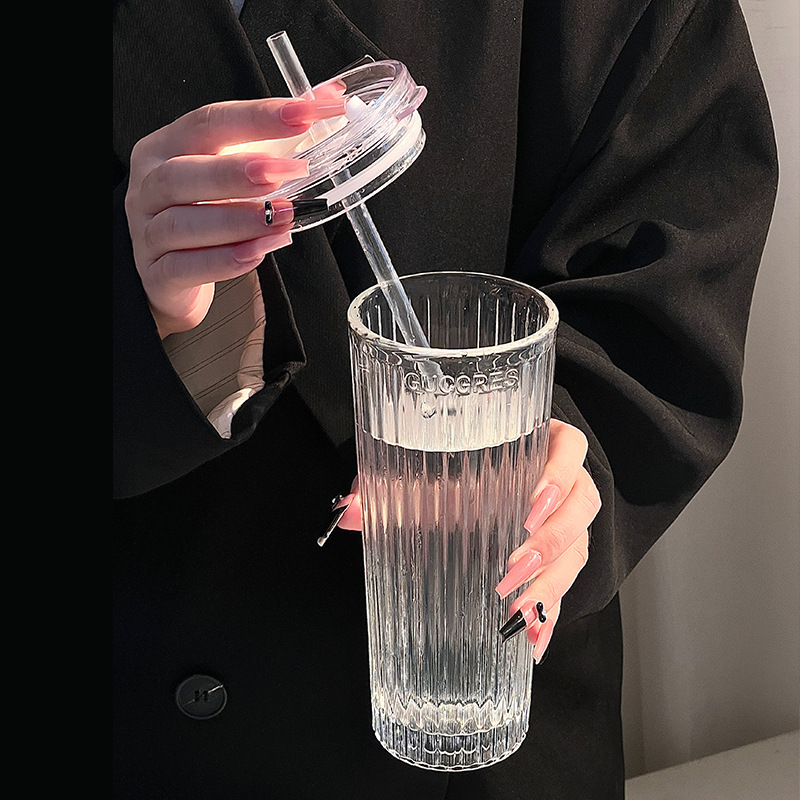 INS スタイルカップ、高品質ジュースユニバーサルウォーターカップ、大容量ストローカップ、オフィスライト高級縦模様ガラスカップ