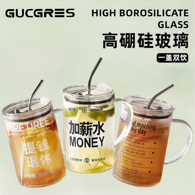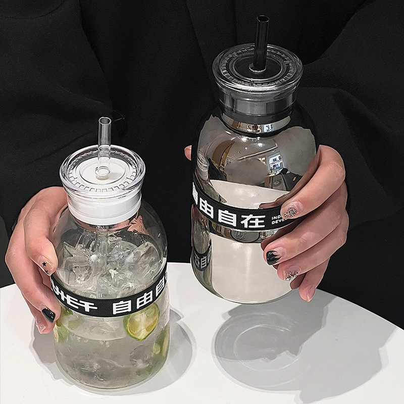 汎用ins大容量ストローカップ耐高温カップガラス水カップ高顔値防漏高ホウ素シリコングラス