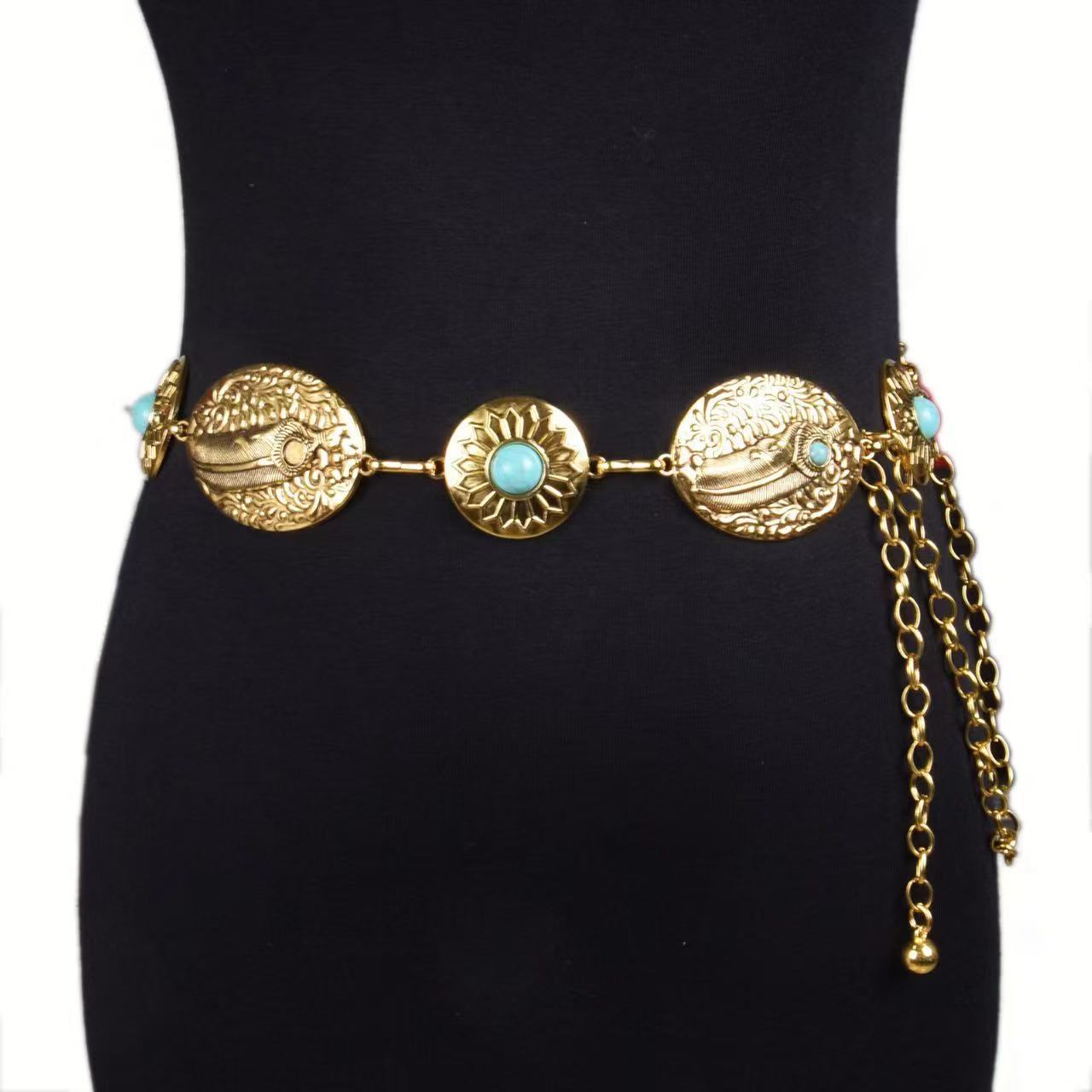 女性のエスニックスタイルの金属ウエストチェーン、松花石付き、レトロな彫刻が施されたベルトチェーン、スカート装飾ベルト付き