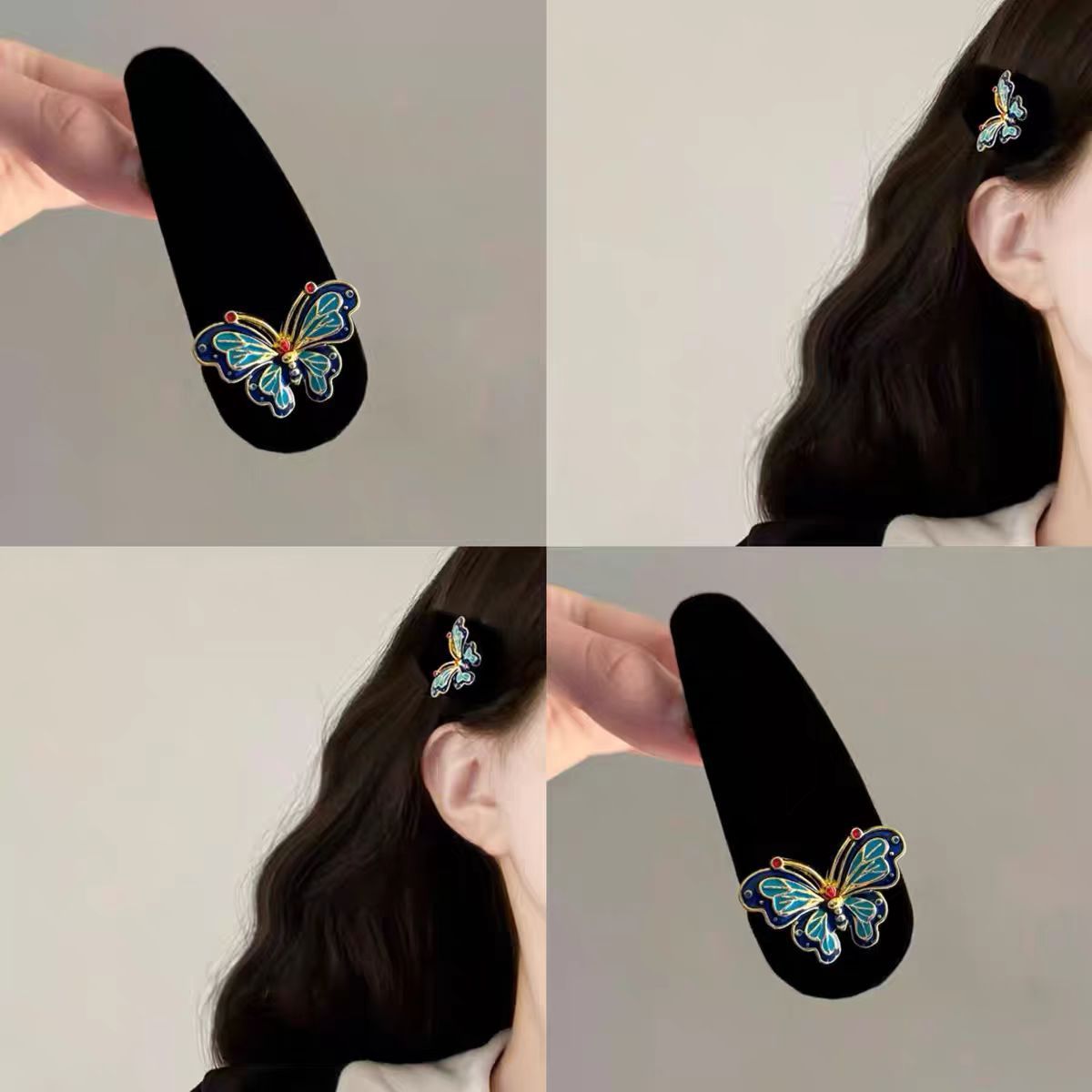 新しい中国式のレトロなベルベットの油を垂らした蝶のヘアピンの女性の国風の高級感のクリップの百合の気質の前髪クリップの髪飾り