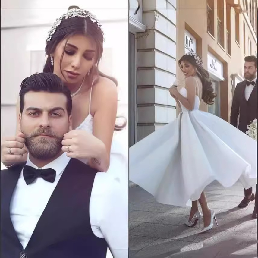 ウェディングドレス Amazon 欧米風 2025年新作 ホワイト Aライン ショート丈 サテン ショルダーストラップ レースアップリケ ブライダルドレス