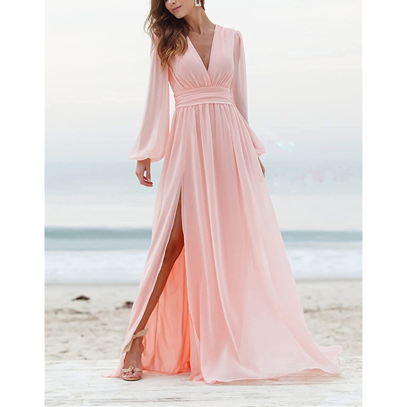 アマゾンのクロスボーダーのドレスvネックの長いサイズのシフォンの宴会の花嫁のドレスのトランペットの袖のワンピースのドレス