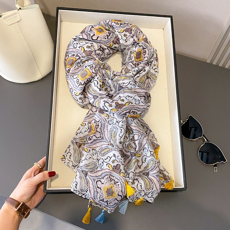 レトロウェアアクセサリー綿とリネンの感触ボイルスカーフエスニックスタイルイエローブルー花柄タッセルシルクスカーフショール女性用