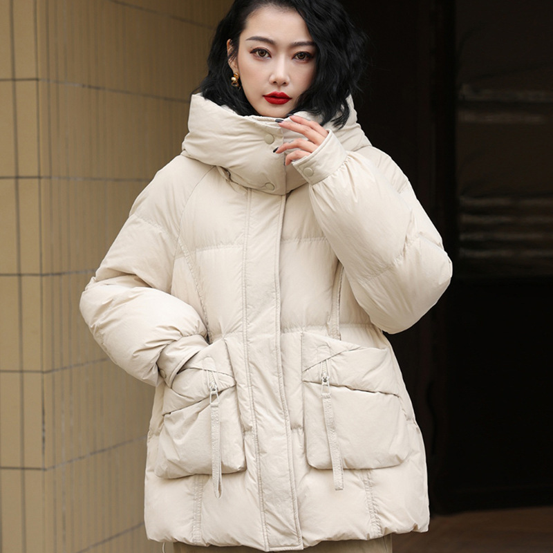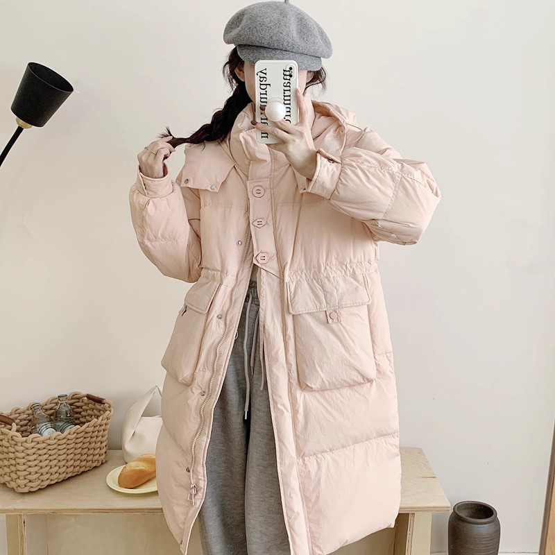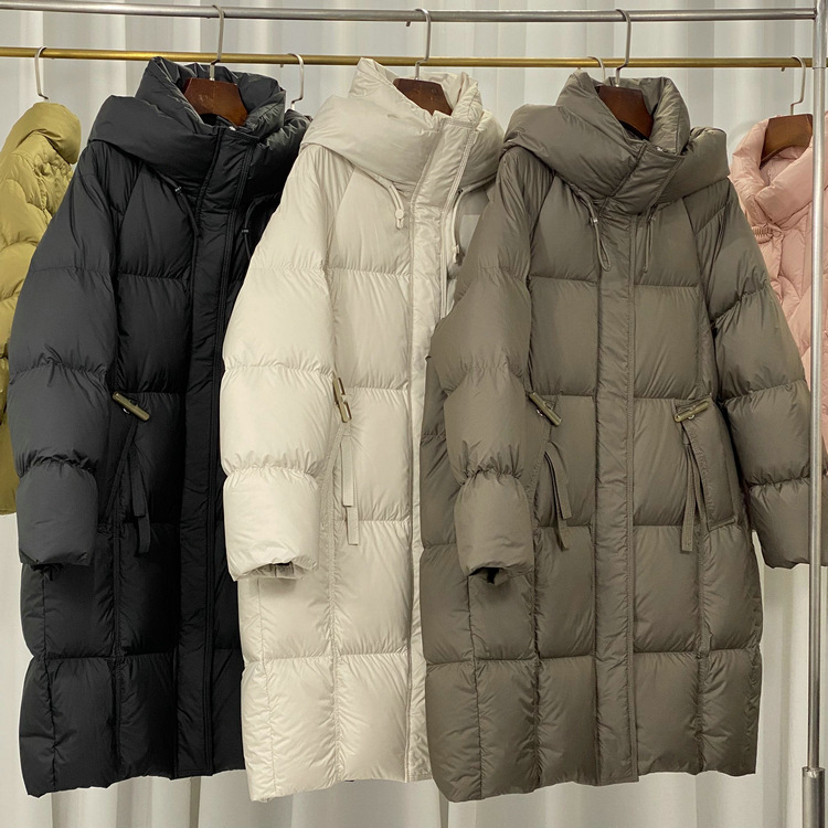 レディース中丈ダウンジャケット 2025年新作 膝丈以上 ホワイトダックダウン フード付き 厚手 韓国風 ゆったり ウエストシェイプ 保温ジャケット