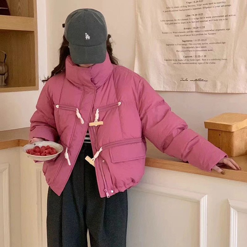 ダウンジャケットの女性の牛の角のボタンの短い金の2024冬のファッションの立襟の小さい背の保温の白鴨の絨毯のパンの服のコート