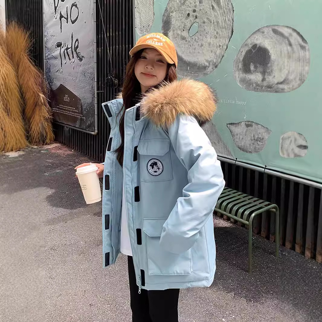 2025 新作ブルーワークウェアパーカーダウンジャケット女性用ミッドレングスラクーンファー大判ファー襟ホワイトダックダウン冬服