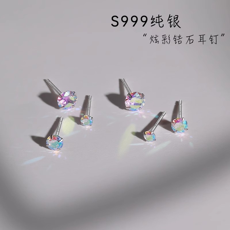女性用999スターリングシルバーイヤリング、カラフルなジルコンイヤリング、耳ピアス、就寝時にイヤリングを外す必要なし、ニッチデザインイヤリング
