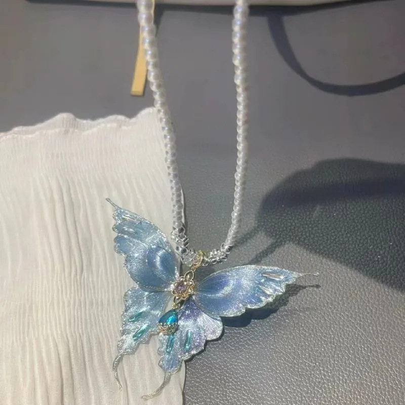 晴山蝶2023年新作優しい癒し系高級真珠幻彩ブルーペンダント蝶ネックレス