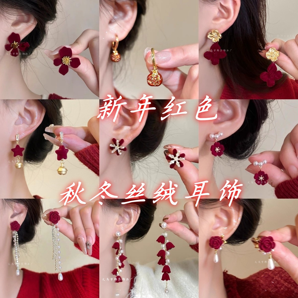 ベロアの雪のイヤリングの女性の大衆の高級感の新年の赤い秋冬の耳飾りの2025の新型の爆発金の新年のピアス