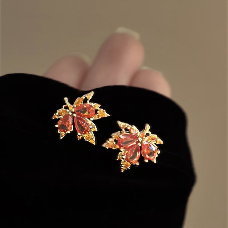 「秋の落ち葉」はだめなフレンチジルコンのカエデの葉のイヤリングに輝いています。