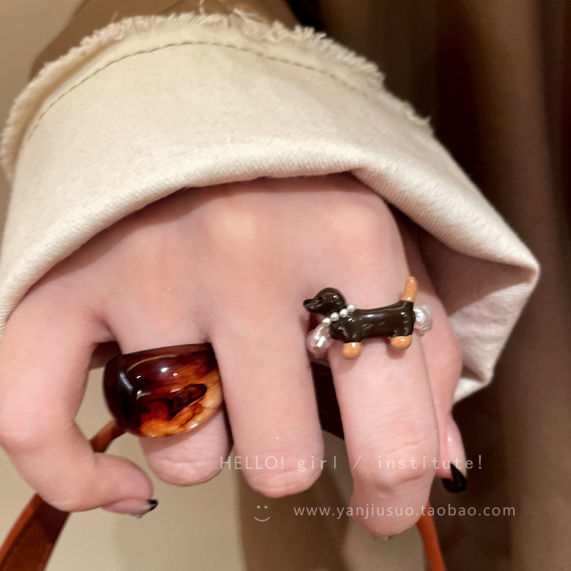 かわいい子供の趣味の黒いソーセージの犬の真珠の指輪の女性の金の小さい大衆の独特な設計の食事の指輪の個性の精巧な指輪