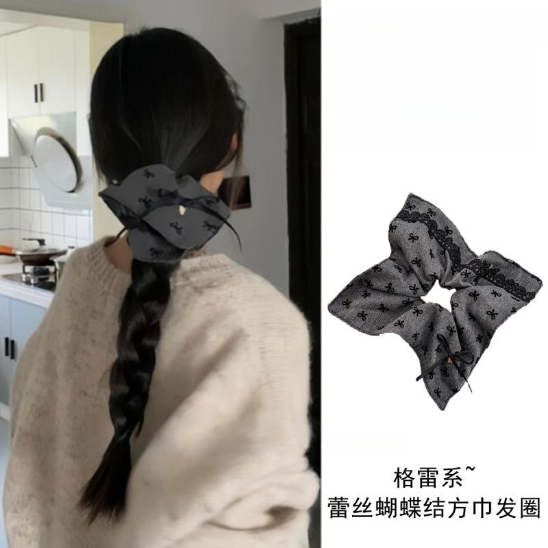グレイル系〜グレー蝶結び角巾大腸シュシュレディースレトロ高級感超特大レース髪ひも
