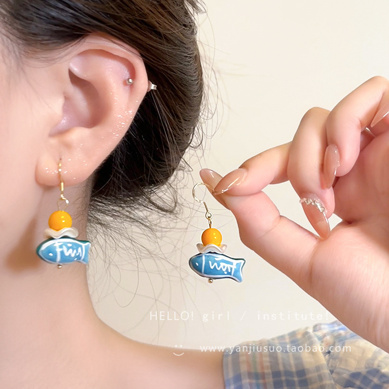 レトロな手描きの小魚のイヤリングの女性の2024の新型の爆発の小さい大衆の独特な青い周囲の顔の気質の耳飾りの耳のフック