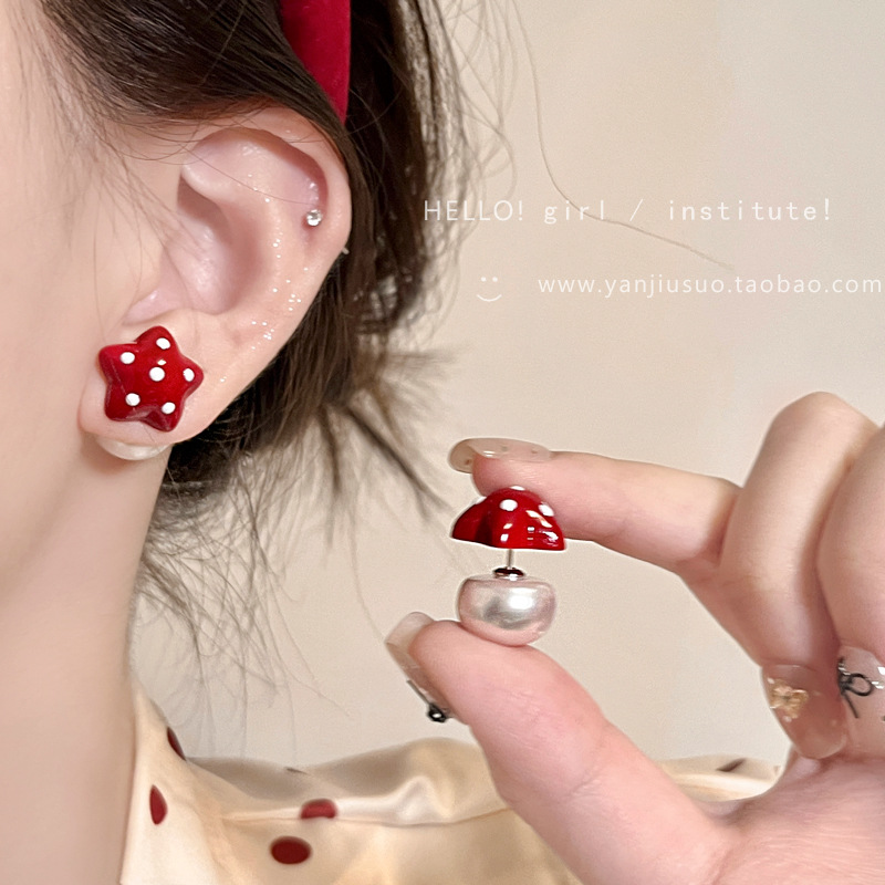 アンコラ赤五角星波点イヤリング女性秋冬高級感後掛け真珠ピアス優しい気質耳飾り