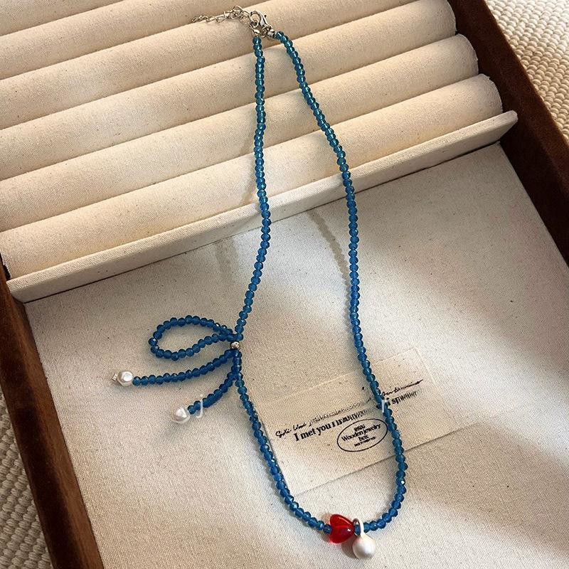 サイドリボンの赤い愛のビーズのネックレスの女性は白いです。