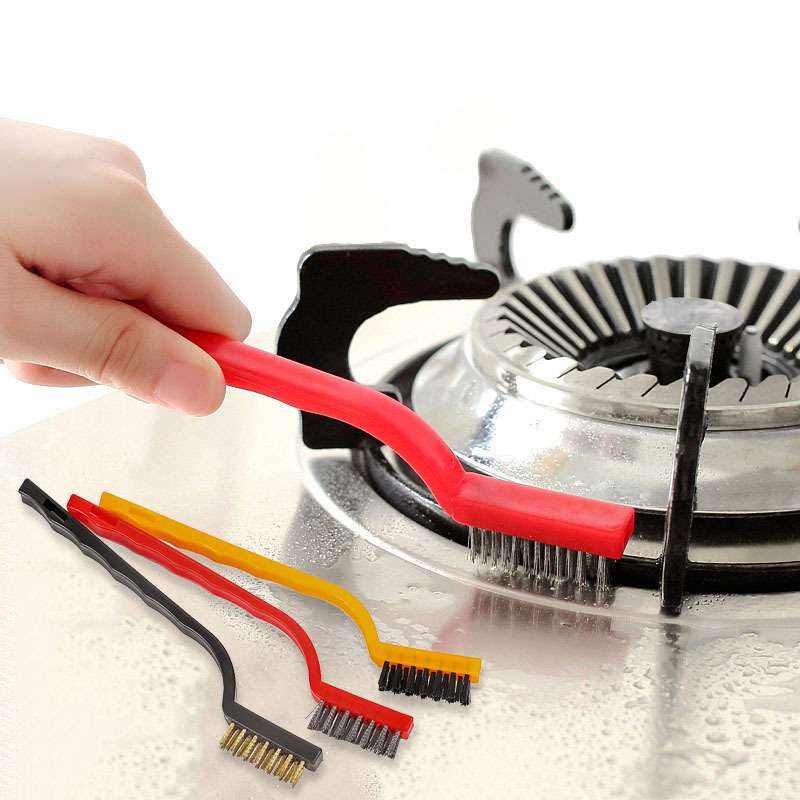 台所のガスコンロの清潔なブラシのかまどのレンジフードの隙間にガスコンロをブラシして油汚れのブラシを取ります。