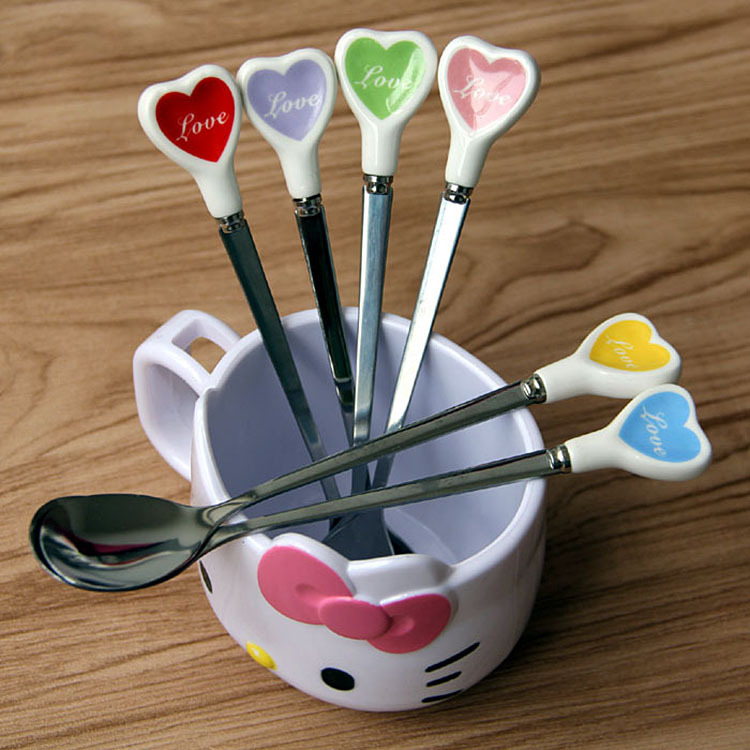 愛の陶磁器の取っ手のスプーンのコーヒーの攪拌のスプーンのかわいいアイスクリームのもちのスープの小さいスプーンのステンレスの長い柄のスプーン