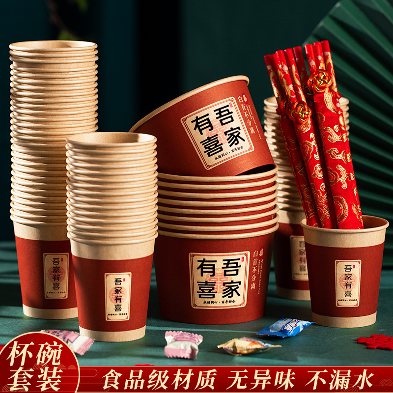 結婚使い捨て紙コップと紙の碗のセットの結婚式の宴会は喜杯の喜碗の食器の披露宴の酒席の用品の大全を招待します。