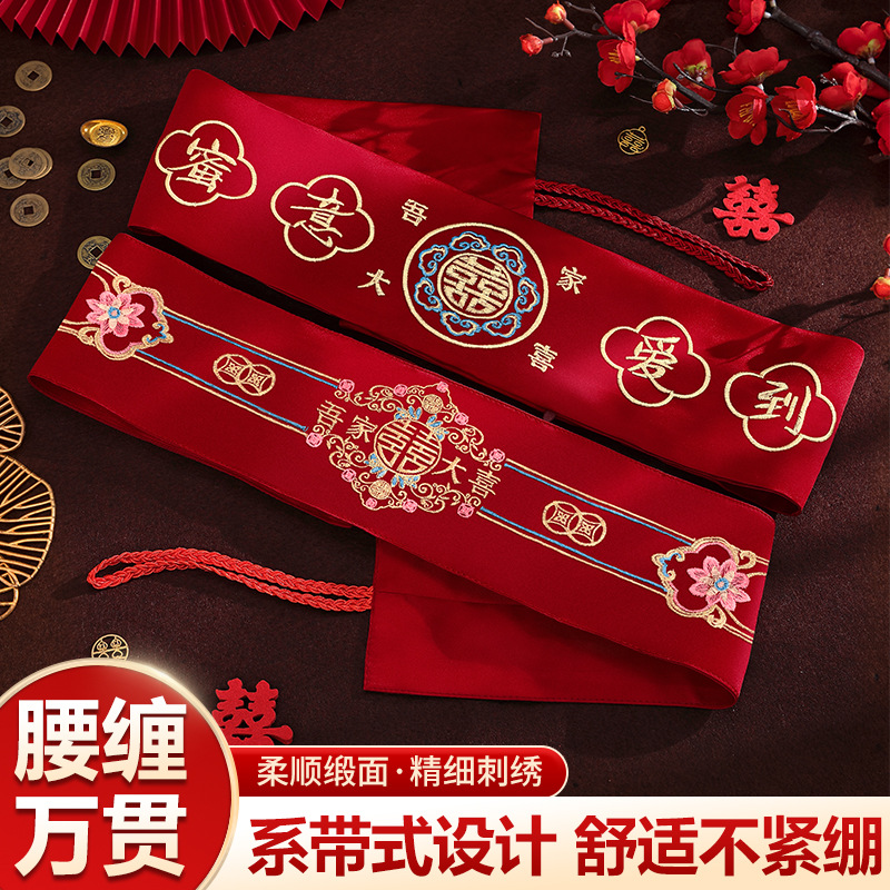 赤いベルトで結婚します。新郎新婦の腰に万貫を巻いてお金を入れます。