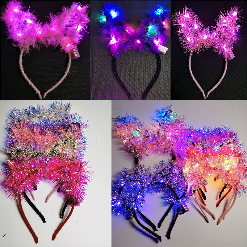 新品発光羽根ウサギ耳猫耳カチューシャ光る花輪夜市露店玩具led金糸カチューシャ