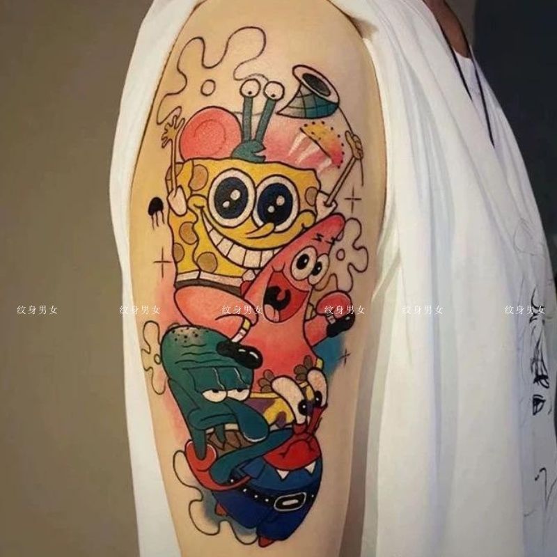 スポンジボブオールドスクールアーム漫画スプライシングフラワーアームカラータトゥーステッカー男性と女性用防水と長持ち